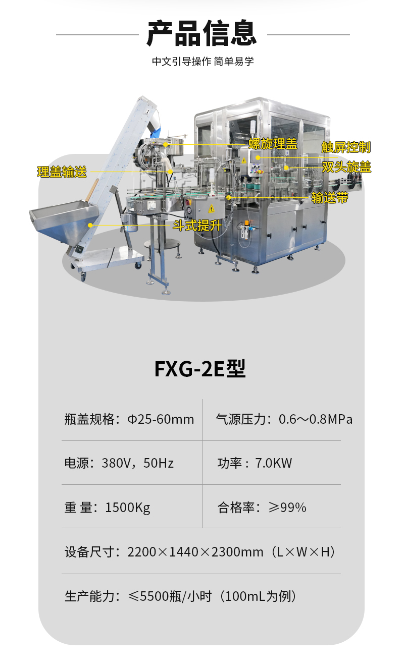 2、品質(zhì)高:跟隨式旋蓋,旋蓋過(guò)程不停頓,不晃液,不污染瓶口、瓶身及輸送帶,確