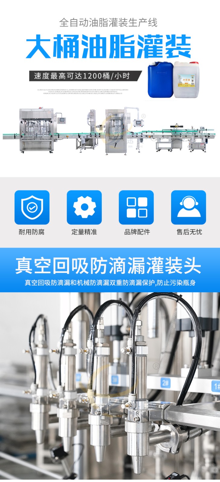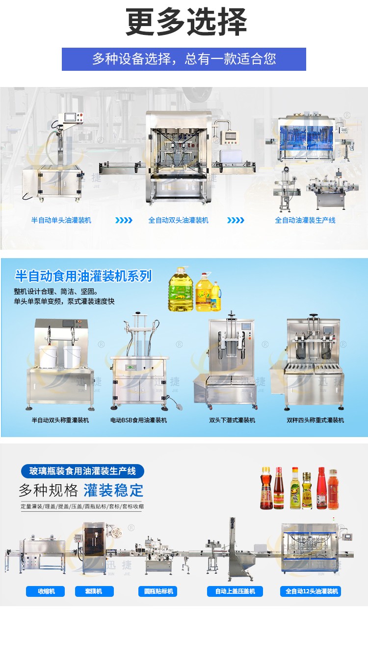 全自動油脂灌裝生產(chǎn)線適用于灌裝各種油類及粘稠液體,如花生油、調(diào)和油、菜籽油等食用油的灌裝??筛鶕?jù)灌裝需求定制機(jī)型。
