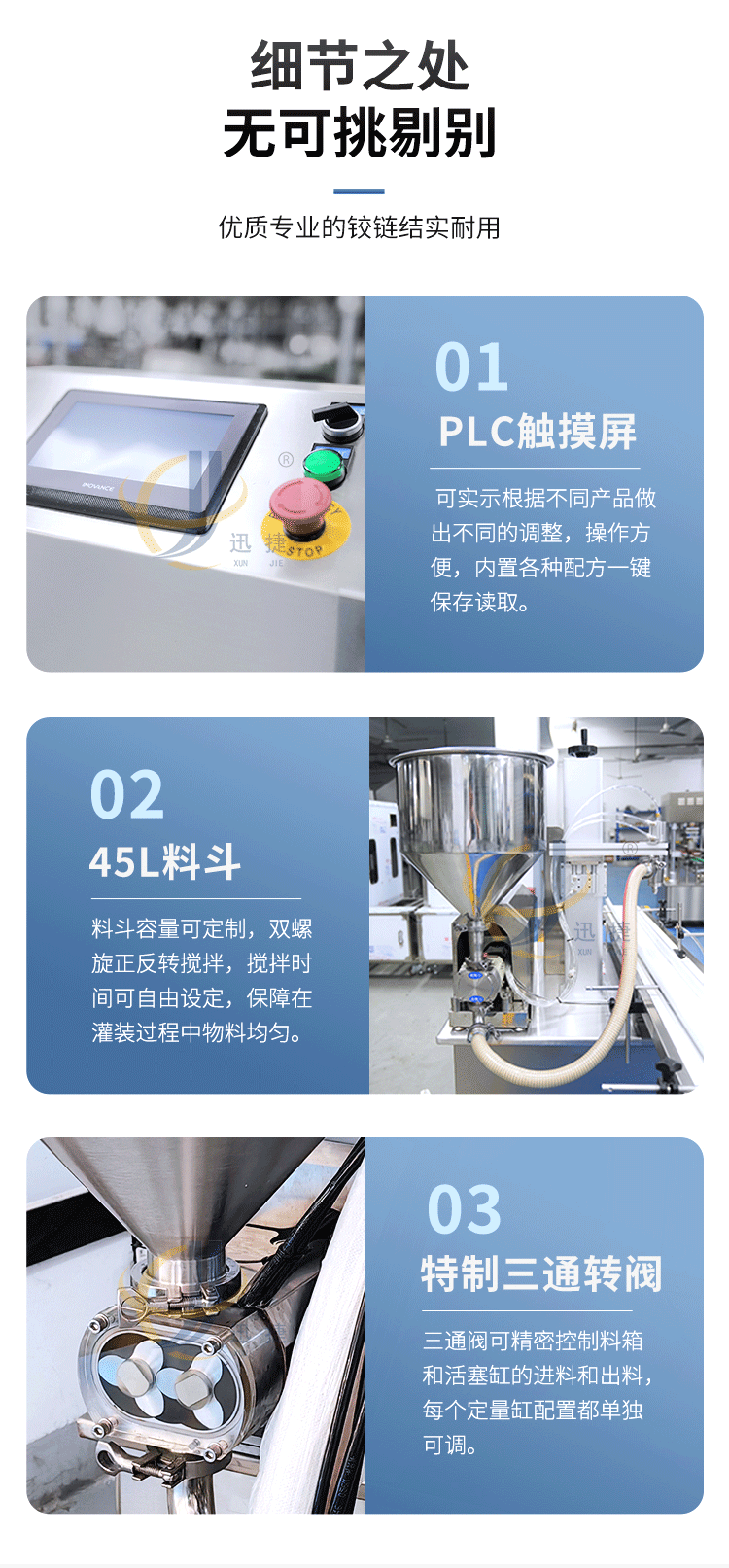 五極灌裝機(jī):極快-單頭2200瓶/時(shí) 極簡-操作簡單 極廣-啥啥都能灌 極穩(wěn)-24小時(shí)不停機(jī) 極準(zhǔn)-200g誤差小于1g。它可以和真空旋蓋機(jī)搭配使用。