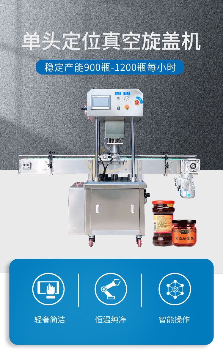 單頭定位真空旋蓋機適用多種瓶型。通過更換模具,即可適合于不同形狀、尺寸瓶子的真空旋蓋,換產方便。